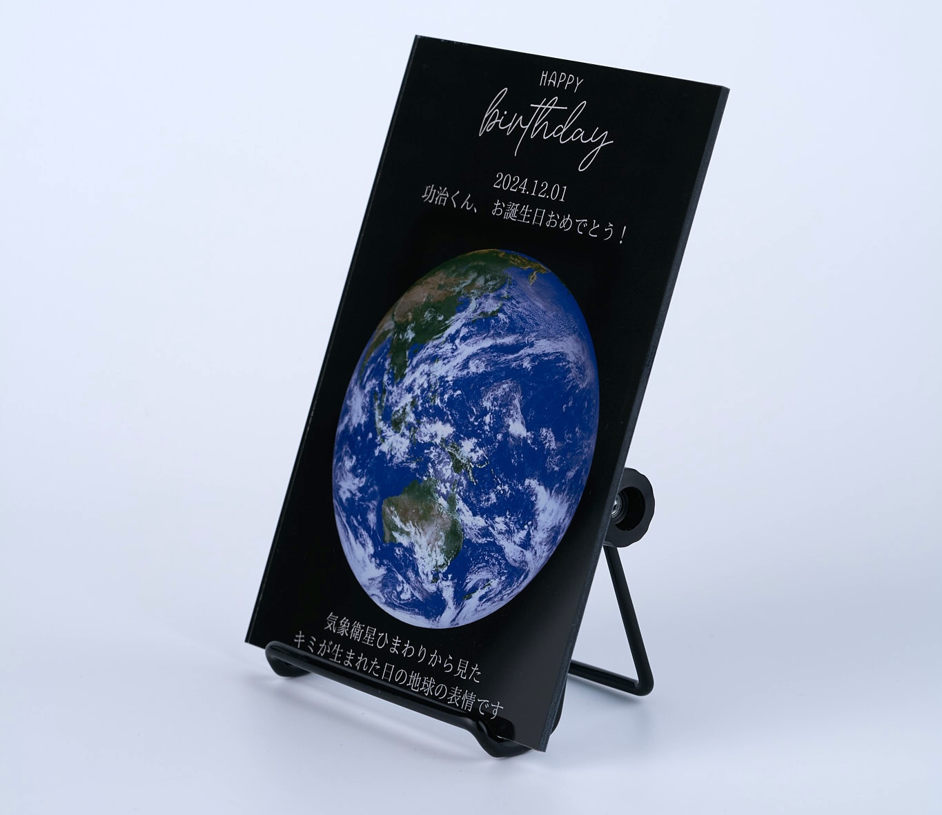 オリジナルメッセージ入りの地球を、透明感のあるアクリルフレームに収めてお届け。