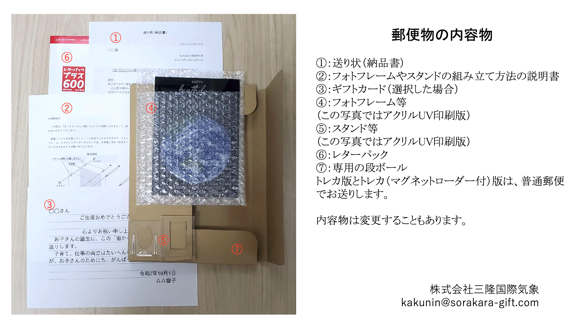 オリジナルメッセージ入りの地球を、透明感のあるアクリルフレームに収めてお届け。